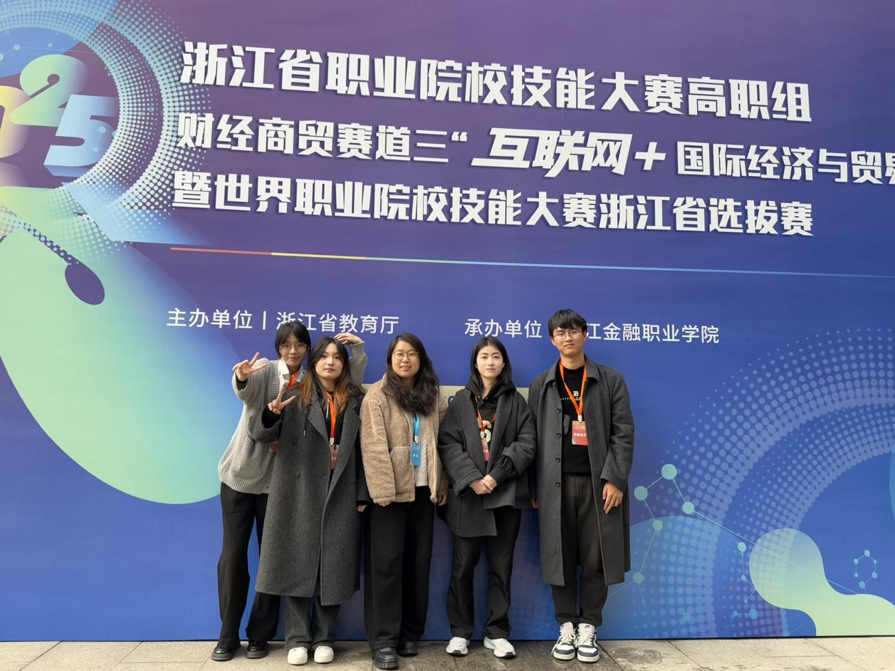 近日,2025年浙江省职业院校技能大赛高职组财经商贸赛道三“互联网+国际经济与贸易组”竞赛在浙江金融职业学院举行,来自全省32所院校的58支代表队伍共231名选手同台竞技。数字商务学院国际经济与贸易专业周露、金毓老师指导的华羽菲、程云龙、叶静、崔诺曦荣获铜奖。